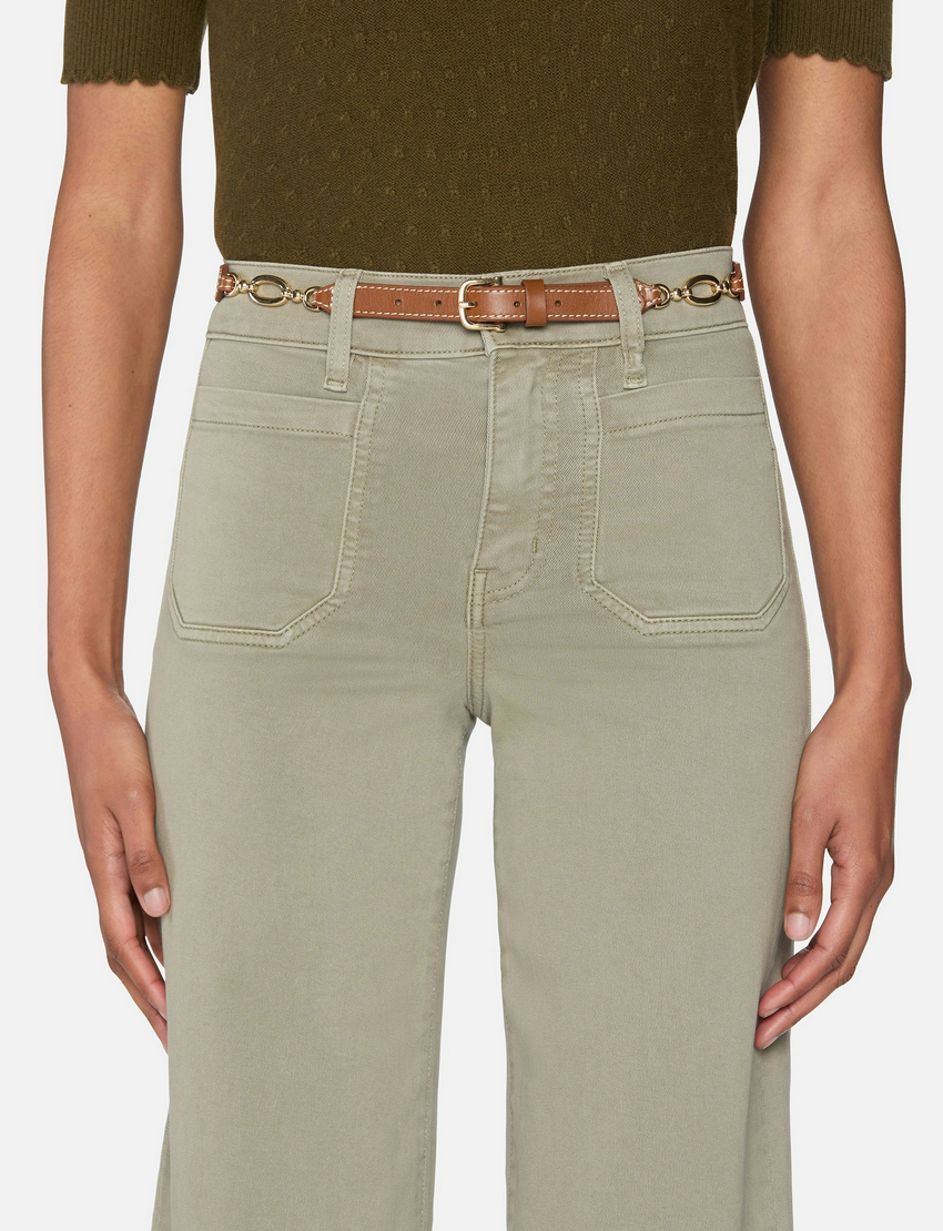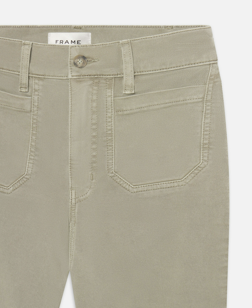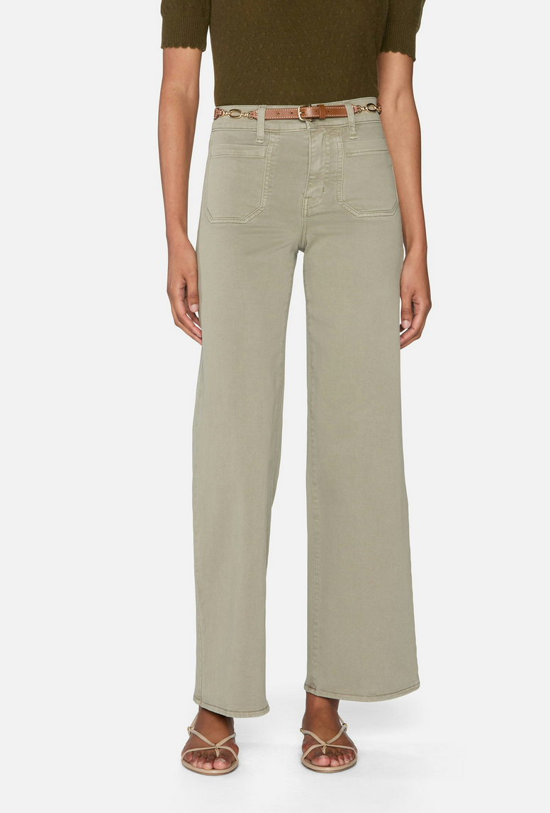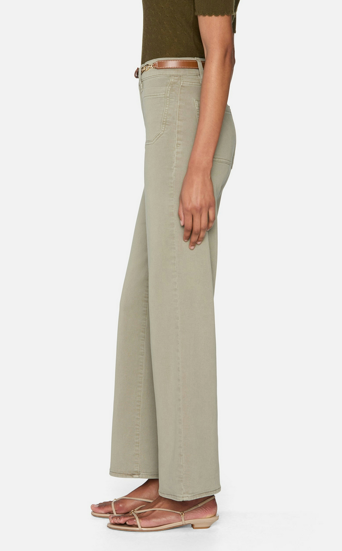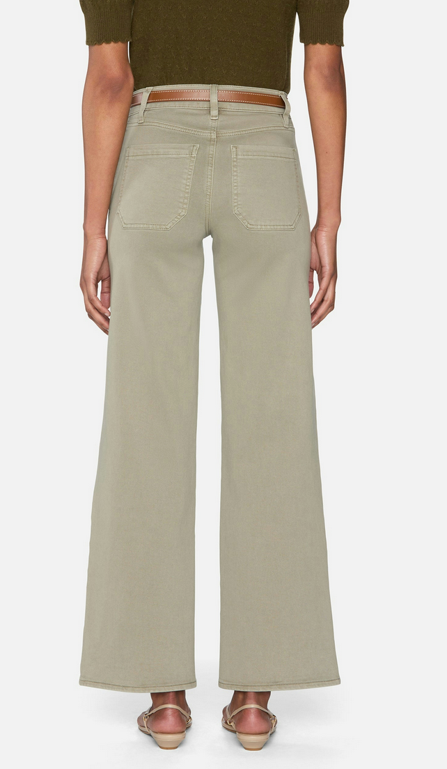 This palazzo silhouette, has chic front pocket details. A flattering high rise, fitted hip, and subtle wide-leg flare that hits at the floor. Crafted from a sustainable, ultra stretch cotton blend for soft and comfortable wear.