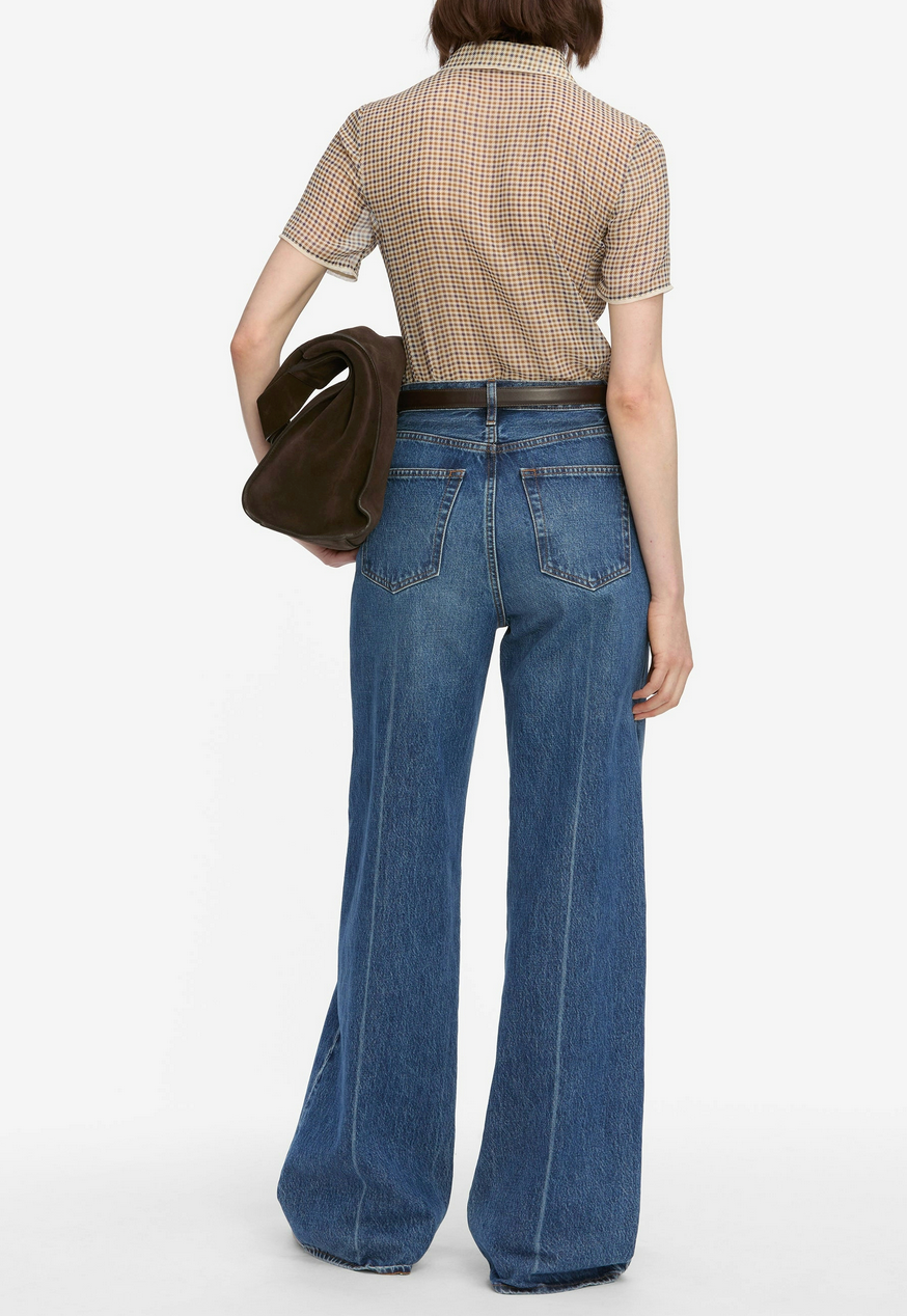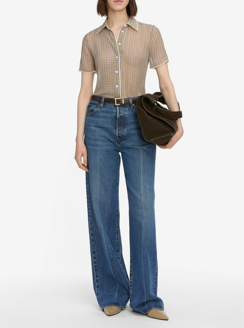 A slim-fitting, semi-sheer, houndstooth blouse in exquisite 100% silk with delicate mesh trim. Polished enough for work—especially if you work in fashion.