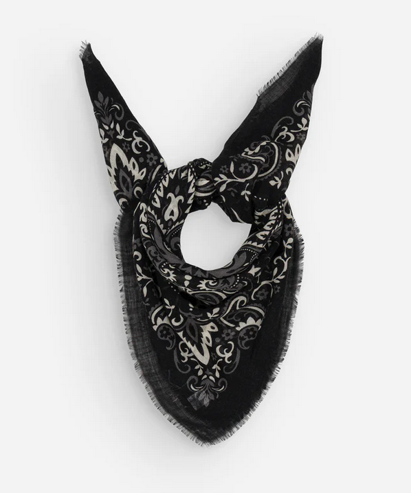 Black Bandana Scarf in wool and cashmere, an exquisite creation by Maison Lecomte Flament. The combination of soft wool and sumptuous cashmere creates an elegant accessory, combining warmth and sophistication in a refined black palette.