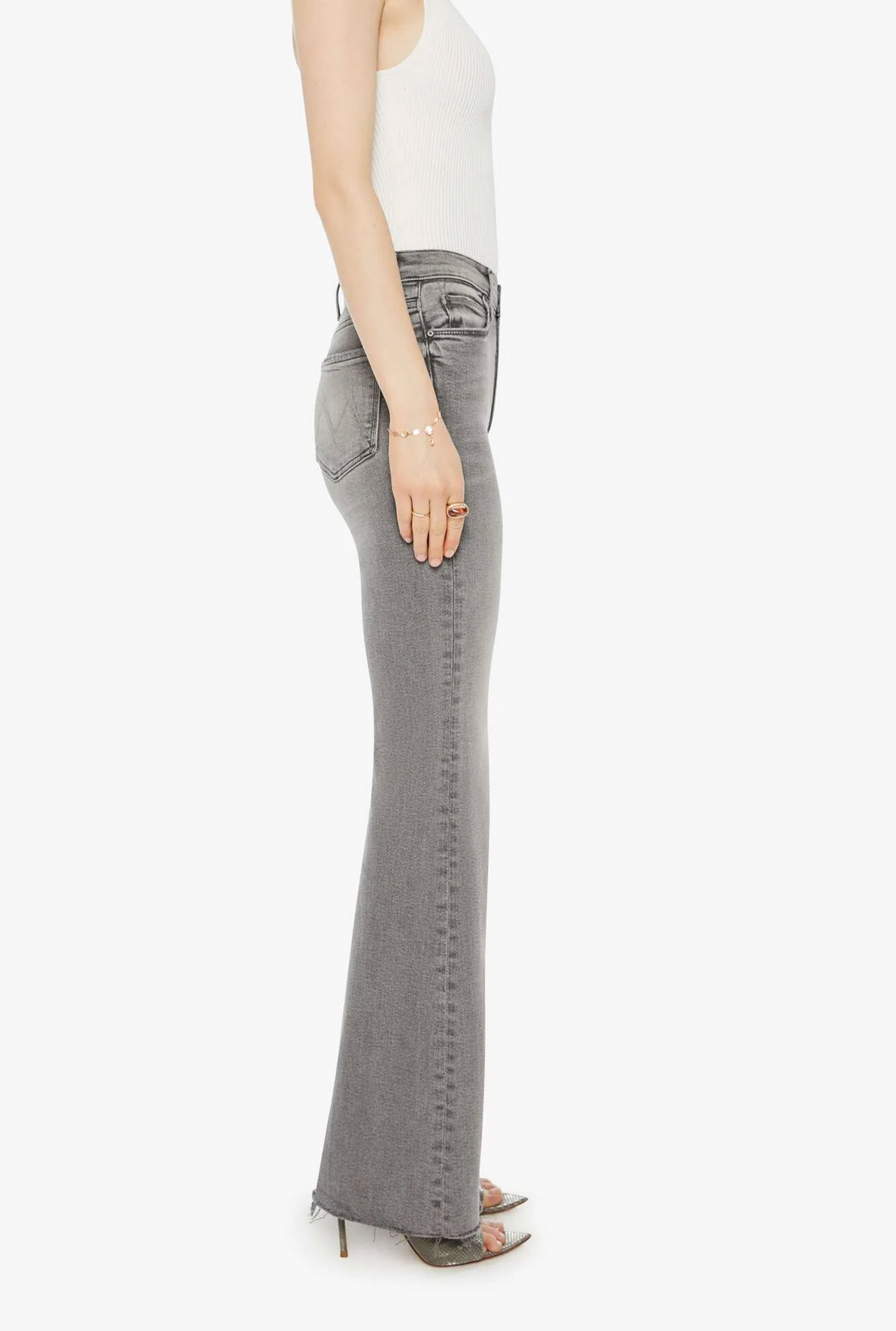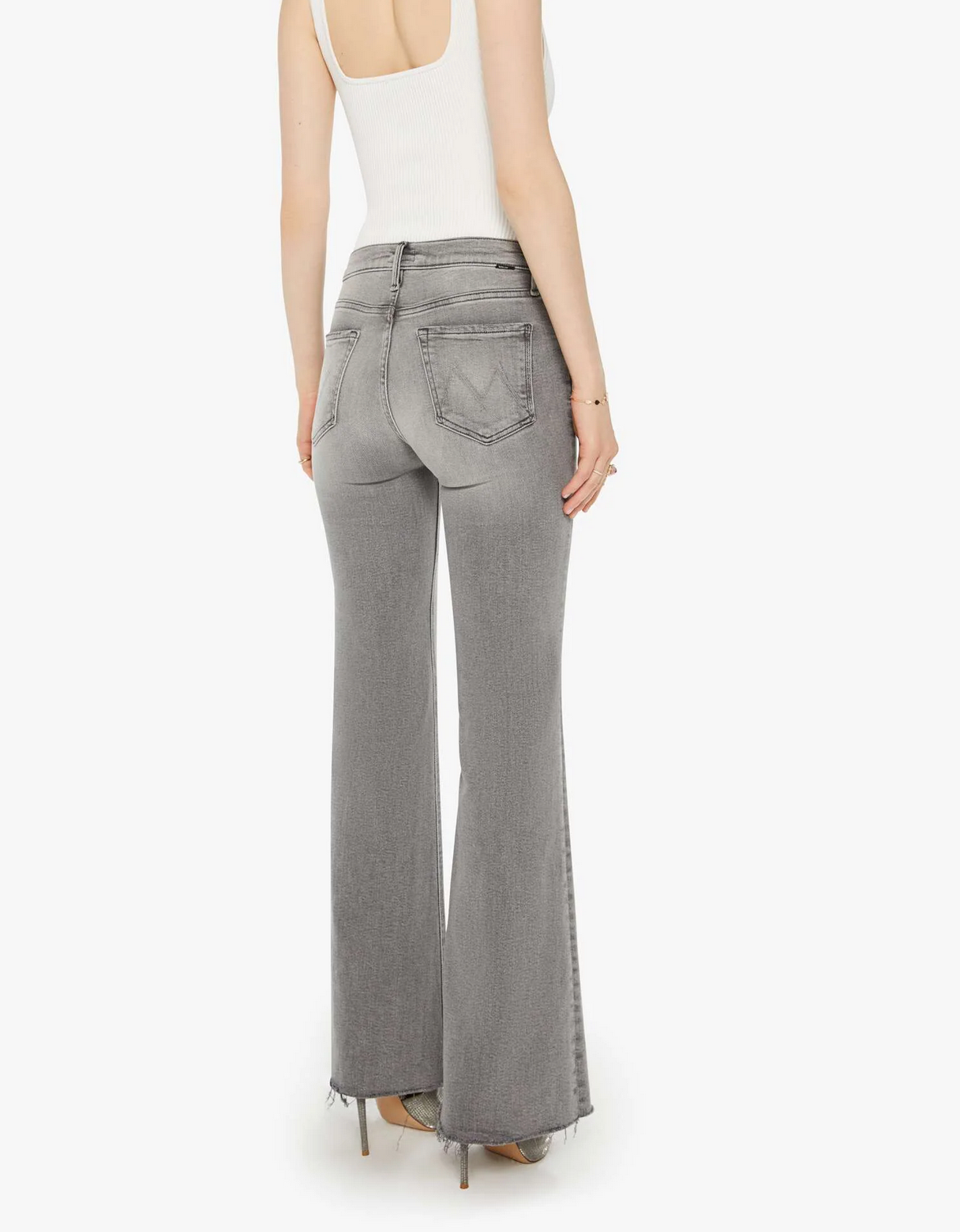 Take a hike. A high-rise flare with a long 32-inch inseam, zip fly and a frayed hem. Made from stretch denim, Catch Me Outside is light grey with whiskering and fading at the knee.