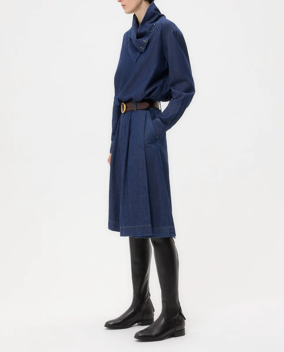 Long-sleeve, funnel neck blouse in dark wash denim shirting. My Maria is a relaxed fit, with an asymmetrical fold over collar that can be buttoned up or down. Complete with a center box pleat at the back, barrel cuffs and curved hem.