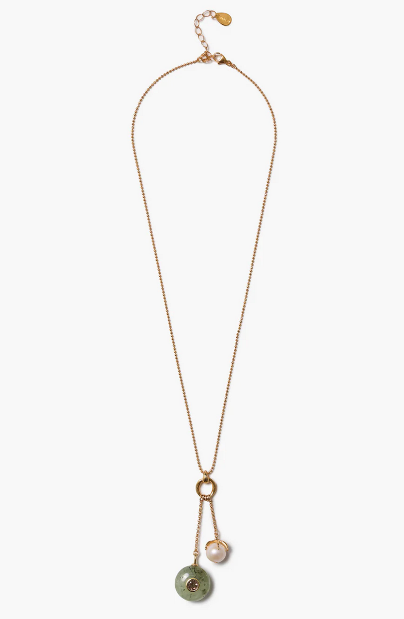 This gold lariat-style necklace features a prehnite stone with a smoky quartz inlay and detailed claw motif holding a luminous freshwater pearl.