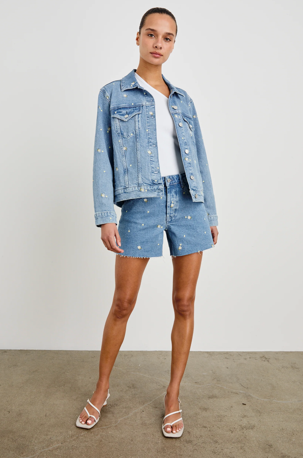 This vintage-inspired Mesa is a high-rise denim cut-off with a slighter longer inseam and relaxed fit. Finished with specialty daisy embroidery, a raw hem and button fly, this short is a warm weather must-have.