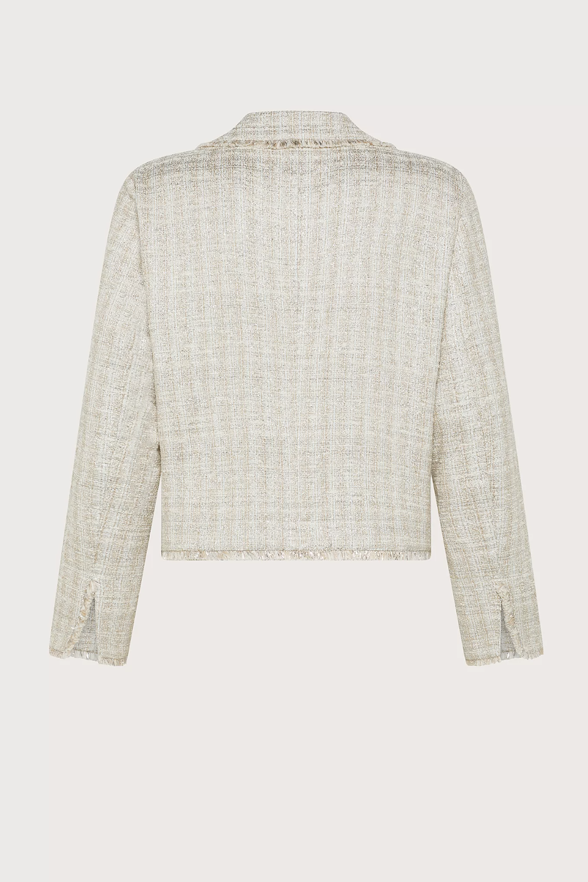 Short jacket made of slub cotton with lurex. Classic lapels and flap pockets. Closure with a single covered button. Fringed edge detail.