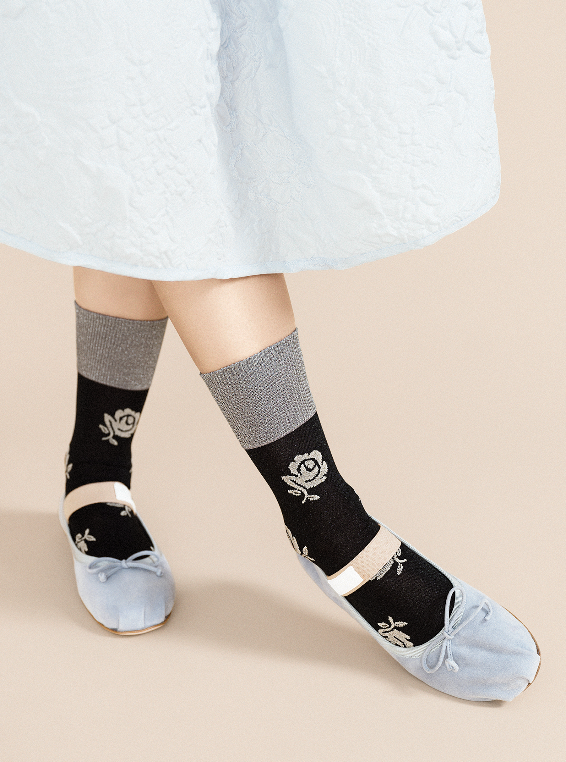 - Black, silver, beige lurex floral print