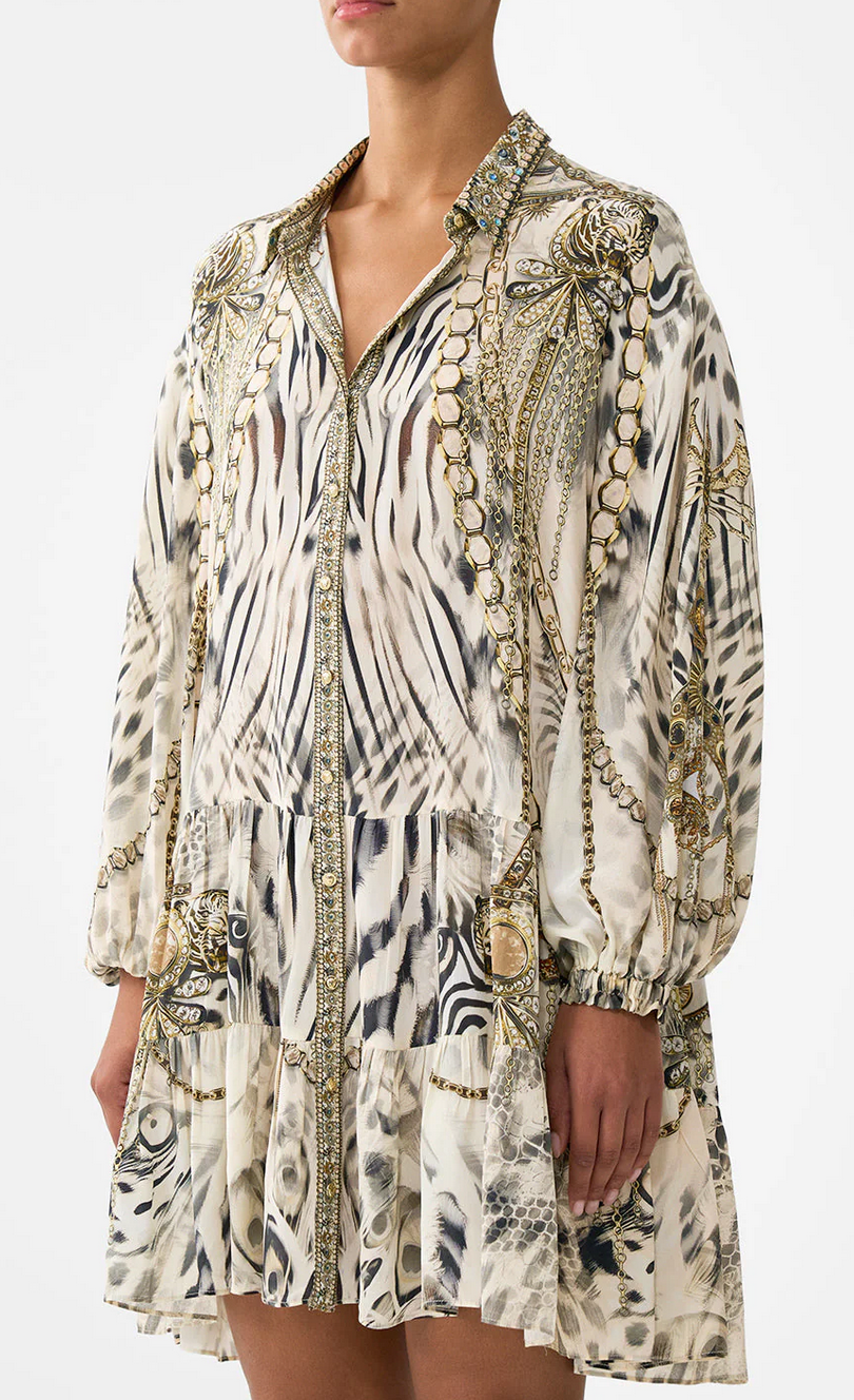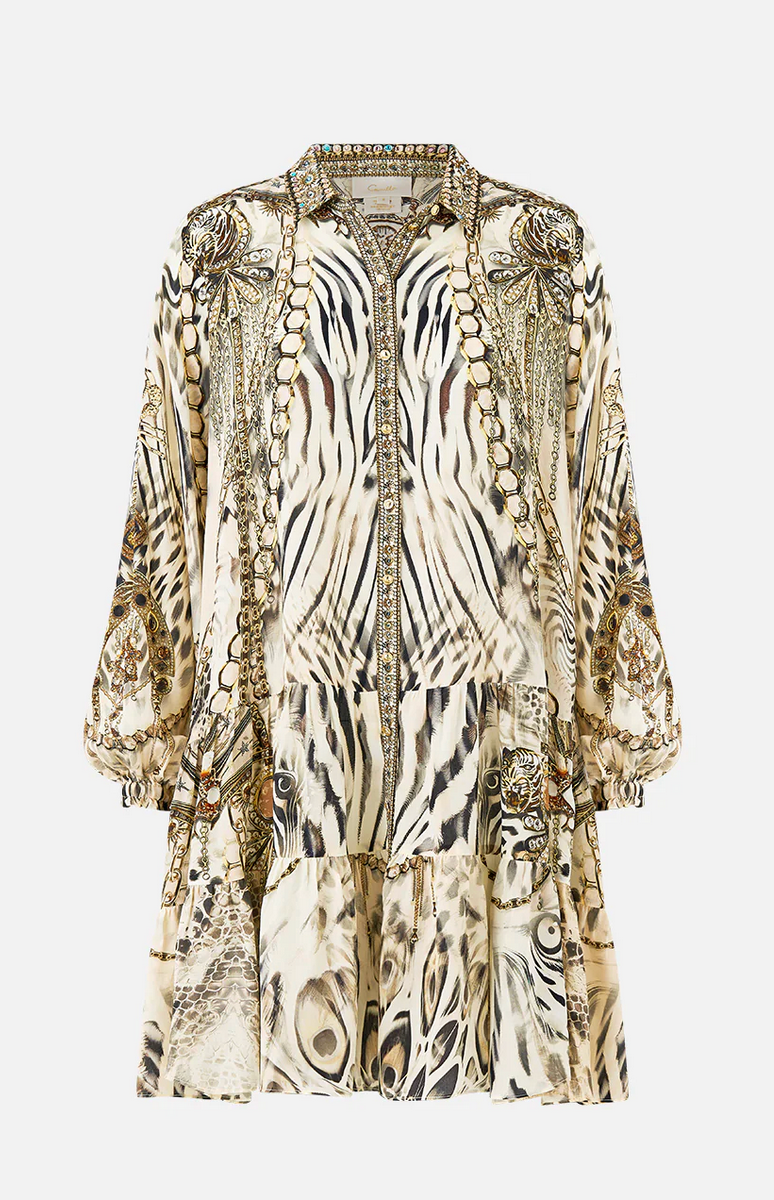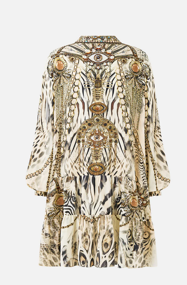 The Lady Lionheart Long Sleeve Tiered Short Dress is a handcrafted silhouette designed by our in house artisans. Reimagined in an exclusive limited edition print, this relaxed mini dress is paired with luscious blouson sleeves