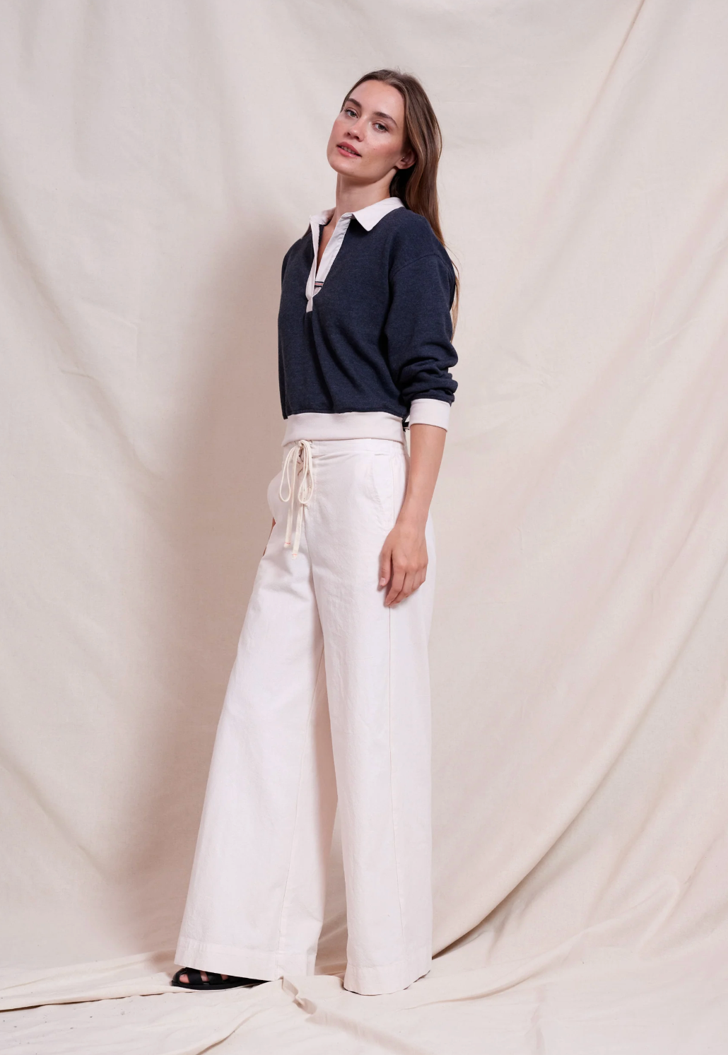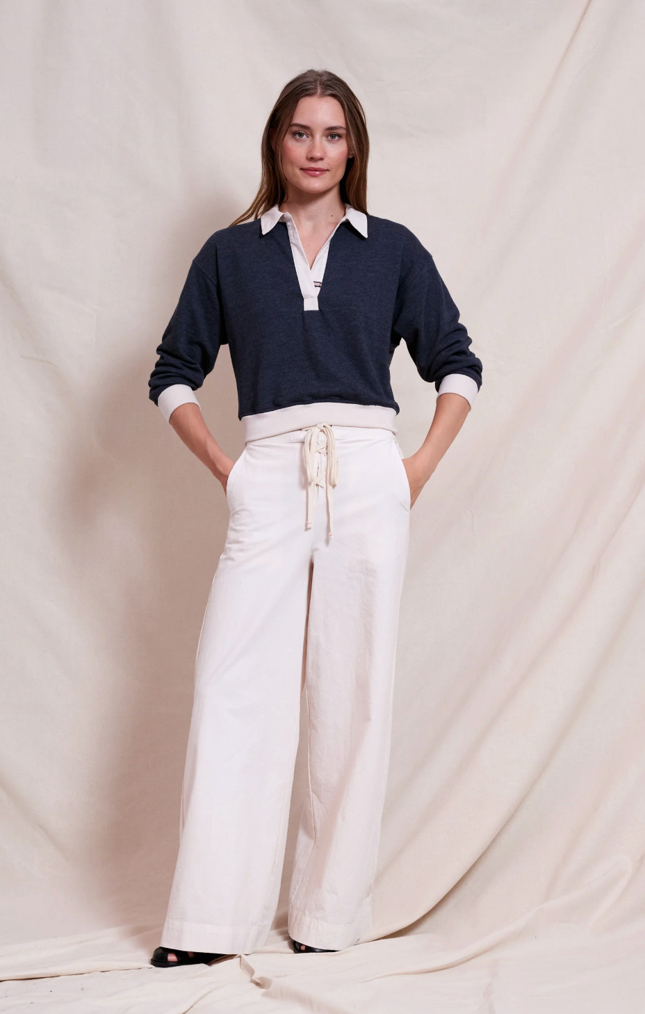 Polo Sweatshirt with accents of white and a deep V. A cute sporty look to pair with our white joggers.