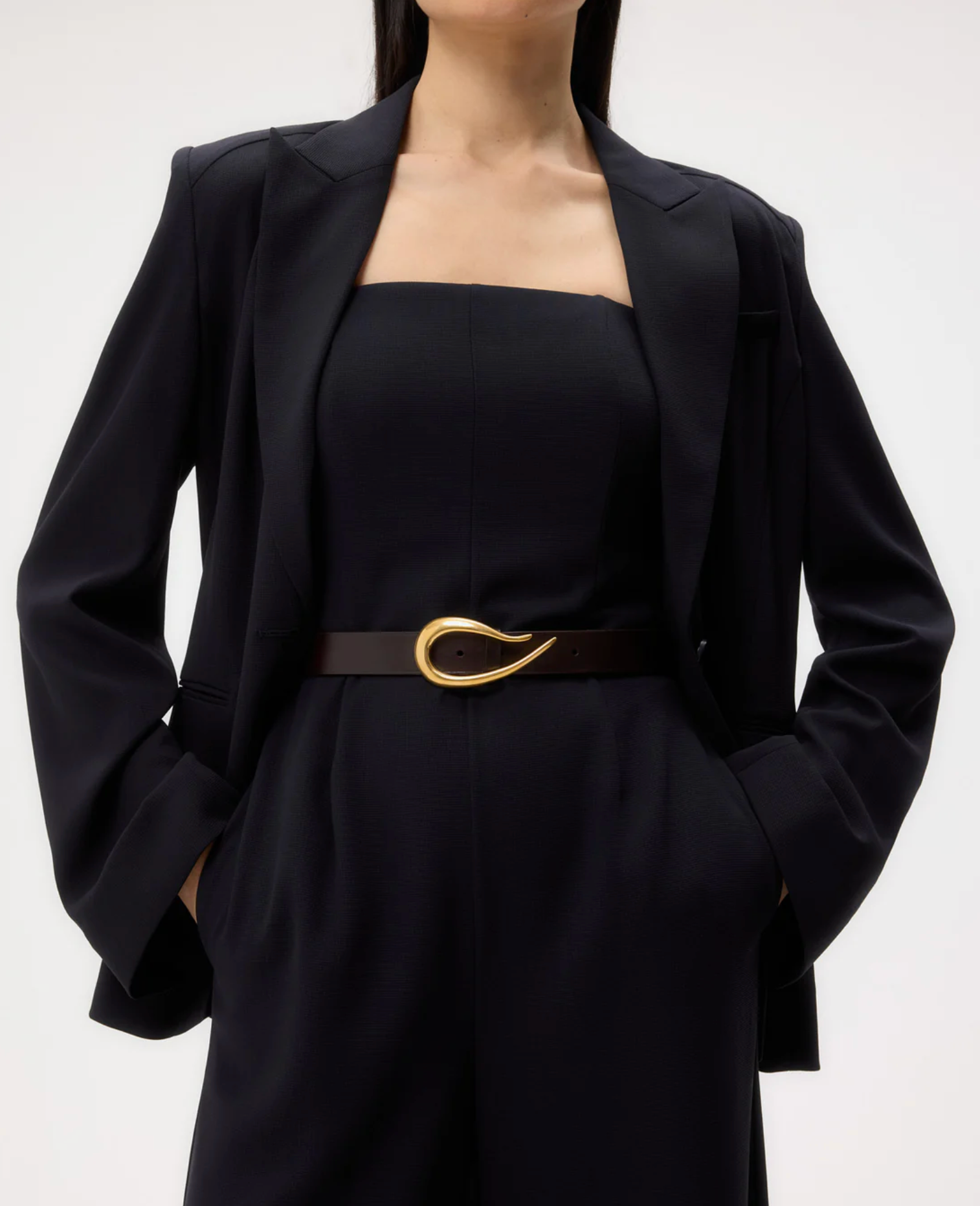 Oversized, one-button blazer tailored in drapey wool crepe. This wool suiting fabric has a natural elasticity and a crepe touch. The Boy Blazer is tailored with a peaked lapel and custom molded shoulder pads. Complete with side pockets, chest welt pocket and back vent.