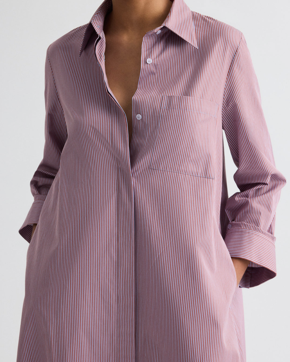 Oversized maxi shirt dress in framed micro striped super italian cotton shirting. Jenny's Gown is a relaxed A-line silhouette. Complete with a button up placket, chest patch pocket, spread collar, and TWP’s signature single roll button cuffs.