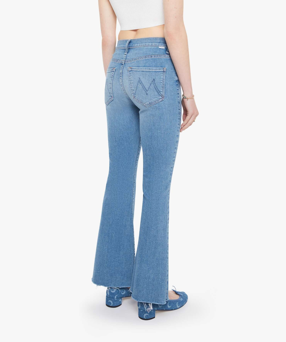 The Weekender Fray is a mid-rise flare jean with a zip fly, and frayed hem. Made from recycled stretch denim in Ride Hard Live Louder, a light blue wash with subtle whiskering and fading at the knees.